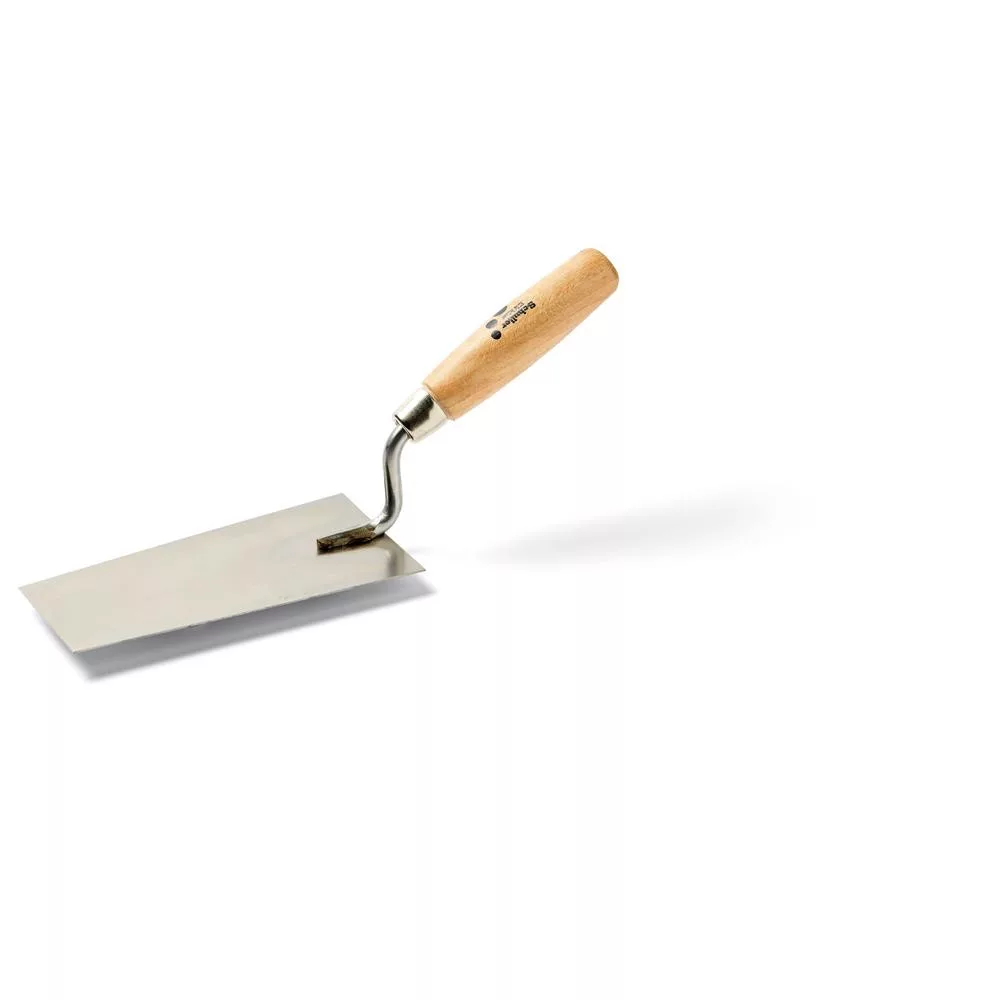 Rozsdamentes acélból készült, fa nyelű markolatú vakolat kanál, kőműves munkákhoz.