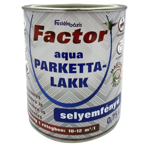 Alkalmazás: A FACTOR Aqua Parkettalakk polyuretan és akrilgyanta bázisú, beltéri felhasználásra ajánlott lakk. Oldószer- és formaldehidmentes, szagtalan, vízzel hígítható. Egykomponensű, könnyen felhordható, gyorsan szárad, ezért a lakkozott felület hamar igénybe vehető. Parketta és egyéb beltéri, fából készült felületek bútor, tornaszerek, lambéria, gerenda lakkozására alkalmas. Előzőleg már lakkozott, festett felületeket is átvonhatunk vele (oldószereseket is), valamint a VALMOR Flexibilis és Csúszásmentes padlófestékeinket is lakkozhatjuk. Ásványi felületek (tégla, kő, vakolat, beton, cserép) valamint tapéta, egyéb papír, gipszkarton lakkjellegű bevonására is alkalmazható. Csúszásmentes gresslap takaríthatóvá tehető használatával.