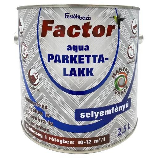 Alkalmazás: A FACTOR Aqua Parkettalakk polyuretan és akrilgyanta bázisú, beltéri felhasználásra ajánlott lakk. Oldószer- és formaldehidmentes, szagtalan, vízzel hígítható. Egykomponensű, könnyen felhordható, gyorsan szárad, ezért a lakkozott felület hamar igénybe vehető. Parketta és egyéb beltéri, fából készült felületek bútor, tornaszerek, lambéria, gerenda lakkozására alkalmas. Előzőleg már lakkozott, festett felületeket is átvonhatunk vele (oldószereseket is), valamint a VALMOR Flexibilis és Csúszásmentes padlófestékeinket is lakkozhatjuk. Ásványi felületek (tégla, kő, vakolat, beton, cserép) valamint tapéta, egyéb papír, gipszkarton lakkjellegű bevonására is alkalmazható. Csúszásmentes gresslap takaríthatóvá tehető használatával.