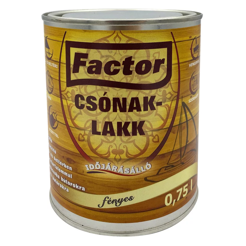 Alkalmazás: A FACTOR Csónaklakk kül- és beltérben egyaránt felhasználható oldószer bázisú különleges Alkid – Poliuretán gyanták keveréke. UV szűrőket, víztaszító viaszokat és speciális adalékanyagokat tartalmaz, így növeli a fa nedvességgel szembeni ellenállóságát és időjárásállóságát. Kültérben alkalmas édesvíznek kitett csónakok védelmére, valamint kemény és nemes fából készült kerti bútorok, teraszok, épületrészek lakkozására. Beltérben puha és keményfából készült fürdőszoba bútorok nedvesség elleni védelmére használjuk. Ne használja olyan felületeken, amelyek közvetlen érintkezésbe kerülnek élelmiszerekkel, takarmányokkal, ivóvízzel.