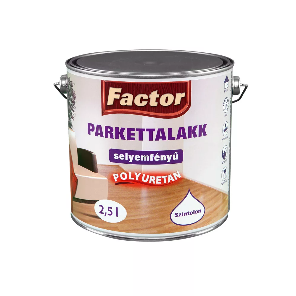 Alkalmazás: A FACTOR Parkettalakk elsősorban parketta, de egyéb kemény fafelületek, bútor, íróasztal, iskolabútor, tornaszerek lakkozására szolgál. Ecseteléssel és szórással egyaránt felhordható. A lakkozott felület rendkívül kopásálló, kemény és csillogó. Egykomponensű, ellenálló termék, ami a felhasználás szempontjából, kiemelkedő előnyt jelent.