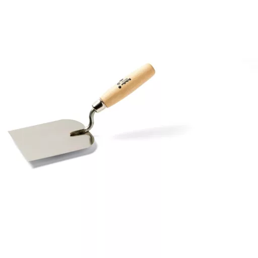 Rozsdamentes acélból készült, fa nyelű markolatú gipsz kanál, kőműves munkákhoz.