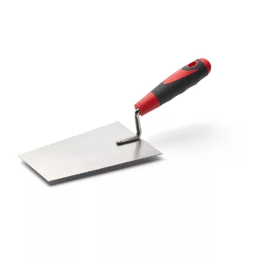 Rozsdamentes acélból készült, ergonomikusan kialakított kétkomponensű markolattal szerelt kőműves kanál, kőműves munkákhoz.