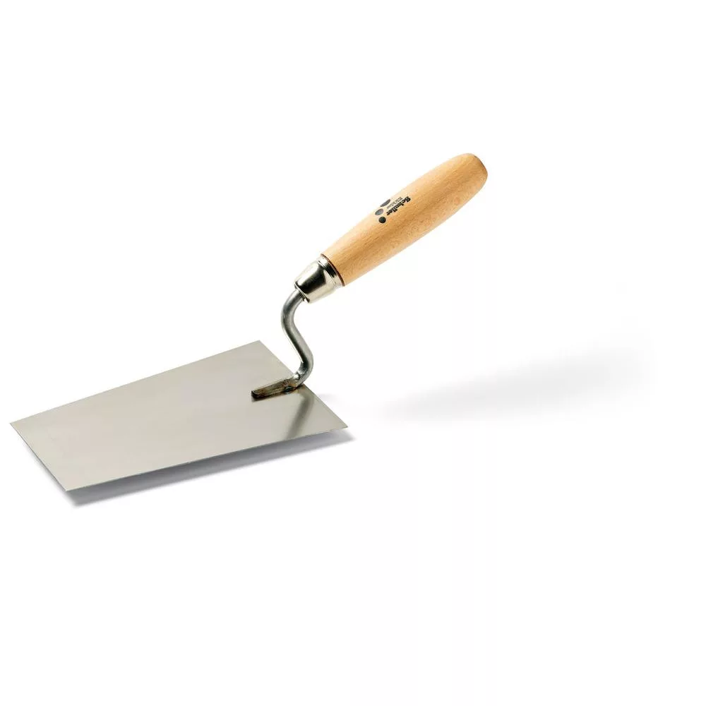 Rozsdamentes acélból készült, fa nyelű markolatú kőműves kanál, kőműves munkákhoz.