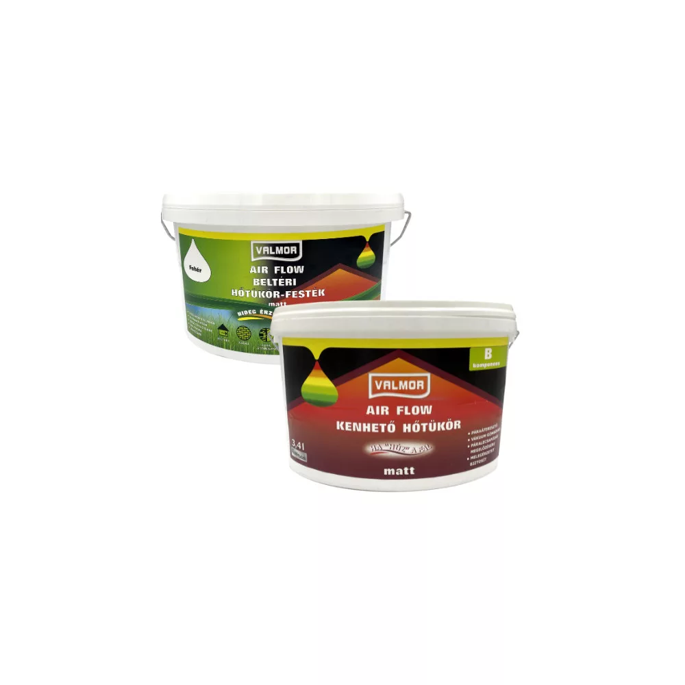 Alkalmazás: A VALMOR AIR FLOW Hőtükör-Festék, 2 komponensből álló együttes A+B, A: VALMOR „AIR FLOW” Lélegző Beltéri Falfesték, B: VALMOR AIR FLOW Kenhető Hőtükör. A VALMOR AIR FLOW Hőtükör-Festék egy olyan anyag, amely mikronméretű kerámiagömböcskéket tartalmaz, speciális kötőanyagba ágyazva.