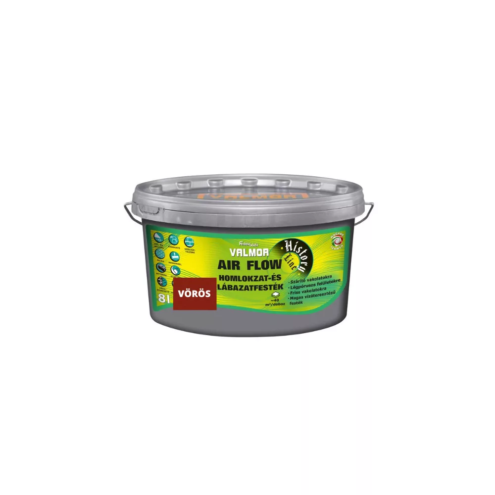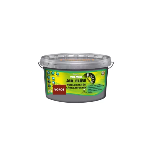 A VALMOR AIR FLOW Homlokzat és Lábazatfesték egy kimagaslóan magas páraáteresztő képességgel rendelkező, környezettudatos, jó fedőképességű, módosított vinil kötőanyagú falfesték. Időjárásálló, szennyeződésnek ellenálló, UV álló. Felhordható normál, lábazati, szárító, páraáteresztő, WTA vakolatokra, betonra, ásványi és lélegző hőszigetelő rendszerekre. A VALMOR Air Flow Homlokzat és Lábazatfesték különleges összetételének köszönhetően a fal természetes légzését nem gátolja, magas nedvességtartalmú vakolatra is felvihető. Kimondottan alkalmas csapó eső elleni védelemre, lábazatok festésére. Ideális a frissen készült új falak, valamint régi épületek rendszeres vizesedési problémával küzdő falazatainak bevonására. Különösen ajánlott a műemlékvédelem területén, a külső illetve belső felújítási munkálatokhoz. A meglévő homlokzati vakolatok struktúráját megtartva könnyen felhordható. MSZ EN 1062-3:2009 szerint magas víz áteresztésű, MSZ EN ISO 77832:2000 szerint magas vízgőz áteresztő képességű.