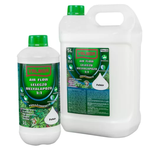 Alkalmazás: A VALMOR AIR FLOW Lélegző Mélyalapozó 1:1 oldószermentes, külés beltérben használható, kimagaslóan magas páraáteresztő képességgel rendelkező, környezetbarát termék. Nedvszívó felületek alapozására ajánljuk, ahol a felület „lélegzése” fontos szempont. A VALMOR AIR FLOW Lélegző Beltéri Falfesték felhordása előtt a használata kifejezetten javasolt. Alkalmas minden ásványi eredetű felületre: szárító- felújító vakolatrendszerekre, normál vakolatra, gipszkartonra, mész-cement alapú felület simító anyagokra, valamint meszelt és nedvszívó képességgel bíró festett felületekre. Alkalmazása során a port leköti, behatol a felület pórusaiba, így erős tapadóképes alapfelületet biztosít. Használatával megelőzhető a felületek esetleges festési foltosodása.