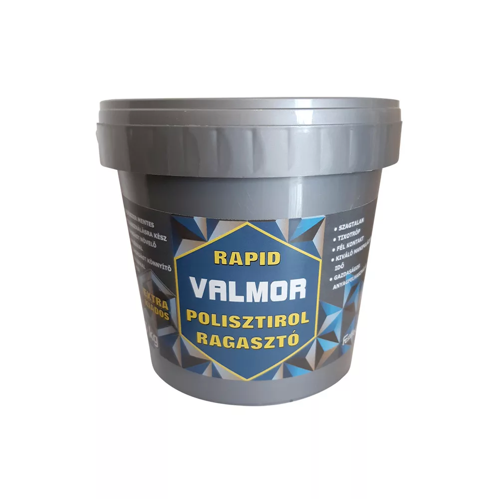 Alkalmazás: A VALMOR Rapid Polisztirol Ragasztó egy kiváló minőségű, vizes bázisú, kül- és beltérben is használható, fagyálló, jól csiszolható és festhető termék. Alkalmas polisztirolból készült díszítő elemek, mennyezeti lapok és hőszigetelő alátétfóliák ragasztására. A VALMOR Rapid Polisztirol Ragasztó minden szilárd, ásványi eredetű felületre, valamint nem nedvszívó alapokra is közvetlenül felhordható (OSB, CK, kerámia, üveg, fa és fa tartalmú anyagok). Alkalmas továbbá habalátétes linóleum és szőnyegpadlók ragasztására is. Használhatjuk kieső fali csempék visszaragasztására, maximum 400cm2-ig.